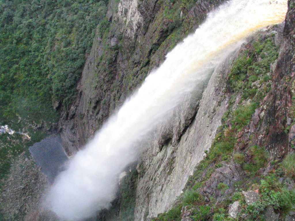 O grande momento acontece ao alcançar a base da cachoeira: ali, cercado por paredes imensas de pedra, é possível sentir a força e a dimensão real da queda — uma perspectiva completamente diferente da vista por cima.